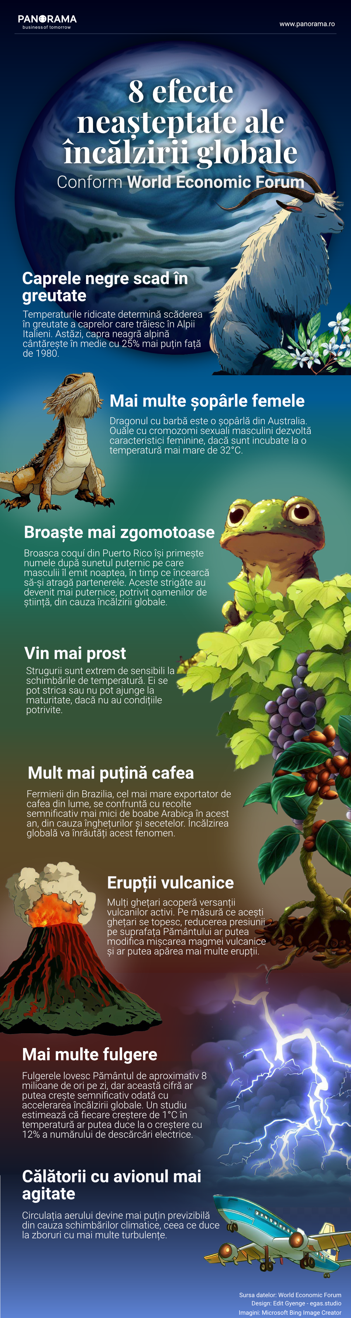 Infograficul de mai jos prezintă cele 8 consecințe identificate de World Economic Forum. E doar un punct de pornire, pentru a înțelege mai bine cât de nebănuite și complexe pot fi  efectele schimbărilor climatice.