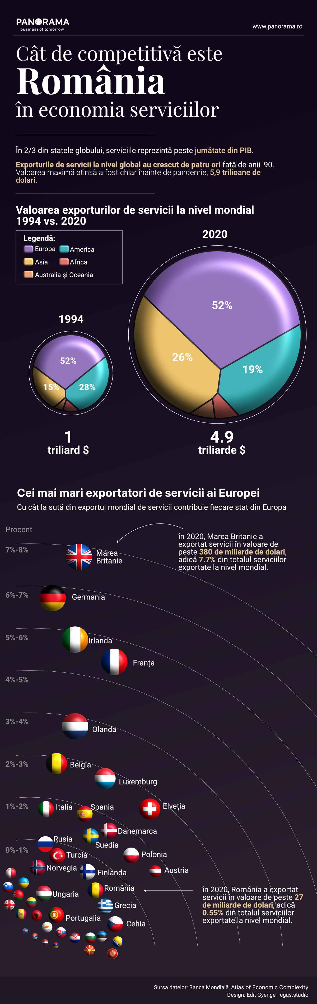 în 2020, România a exportat servicii în valoare de peste 27 de miliarde de dolari, adică 0,55% din totalul serviciilor exportate la nivel mondial.