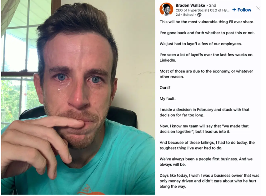 Branden Wallake, CEO al start-up-ului Hypersocial, axat pe marketing și publicitate în social media, a postat și el acum doi ani, pe Linkedin, un selfie în care plânge, după ce a concediat o parte din angajații companiei: