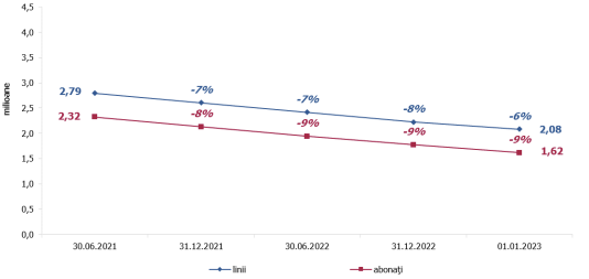 Dinamica numărului de abonaţi și a liniilor de acces la serviciile de telefonie fixă, în perioada 30.06.2021 – 30.06.2023. Sursa: ANCOM