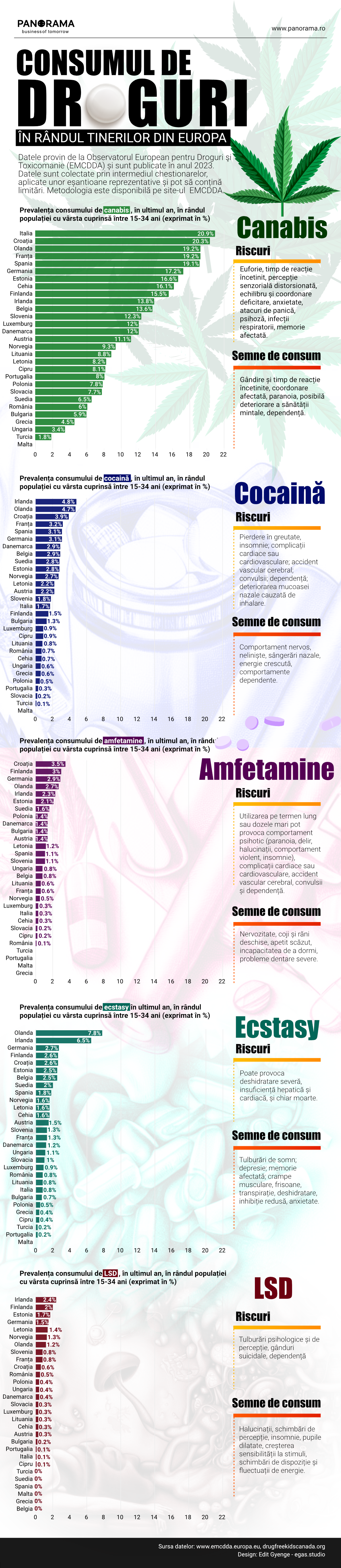 Potrivit acestor date, în România, 6% dintre tinerii cu vârsta între 15 și 34 de ani au declarat că au consumat canabis în ultimul an. Cel mai mare procent îl înregistrează Italia, 20,9%.