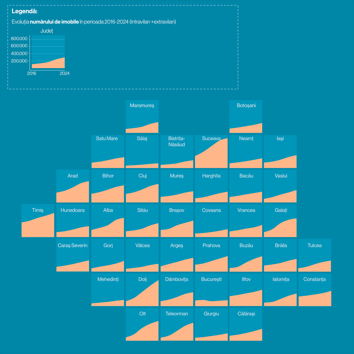 Datele arată că, pe parcursul ultimilor 8 ani, numărul imobilelor înregistrate la cadastru a crescut semnificativ în anumite regiuni ale țării, în special în partea de sud (Olt, Teleorman și Dâmbovița), dar și în Moldova (Vaslui și Iași) și Transilvania (Alba și Maramureș).