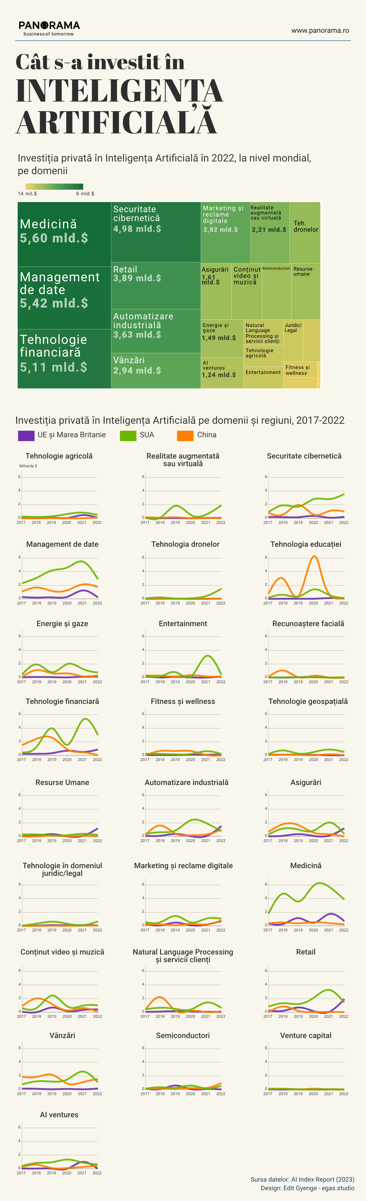 Infograficul de mai jos subliniază domeniile cheie în care s-a investit în sisteme de inteligență artificială și regiunile în care s-a investit cel mai mult.