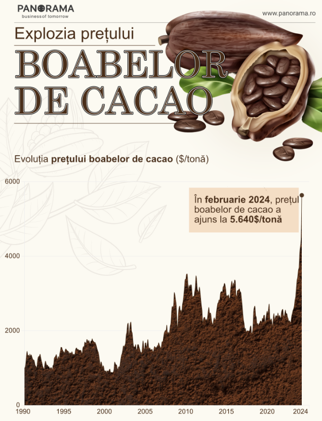 Dacă vi se scumpește ciocolata favorită în apropierea Paștelui, măcar să știți de unde vi se trage. În ultimii doi ani, prețul boabelor de cacao a crescut într-un ritm amețitor, însă apogeul a fost atins acum, în 2024. Tona de cacao se tranzacționa cu peste 9.700 de dolari, la finalul lunii martie, însă a atins și un maximum de peste 10.000 de dolari pe tonă.
