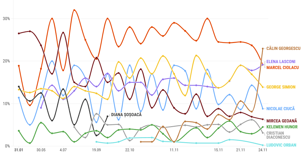 Devine tot mai evident că sondajele de opinie dinaintea alegerilor au devenit aproape irelevante. Edit Gyenge le-a centralizat pe toate pentru Hotnews și le-a pus în fața rezultatelor de la primul tur al prezidențialelor. În afară de Elena Lasconi, care s-a menținut relativ constantă, cea mai mare discrepanță este între Marcel Ciolacu, cotat permanent pe locul întâi, și Călin Georgescu, care apare pe radar cu doar câteva zile înaintea alegerilor.