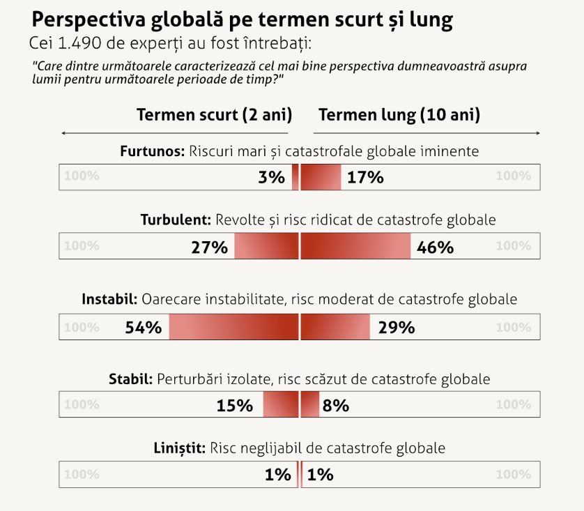 Suntem bombardați zi de zi cu știri despre riscuri iminente și catastrofe care stau să se întâmple, dacă nu s-au întâmplat deja. Care sunt însă cu adevărat pericolele care ar trebui să ne îngrijoreze cel mai mult? Unde ne uităm mai întâi? Aproape 1.500 de experți au făcut acest exercițiu pentru noi. Ei s-au uitat la cele mai mari riscuri pentru omenire în cinci domenii: economie, mediu, geopolitică, societate și tehnologie. Edit Gyenge le-a sintetizat răspunsurile într-un infografic despre riscurile anului 2024 și ale viitorului.