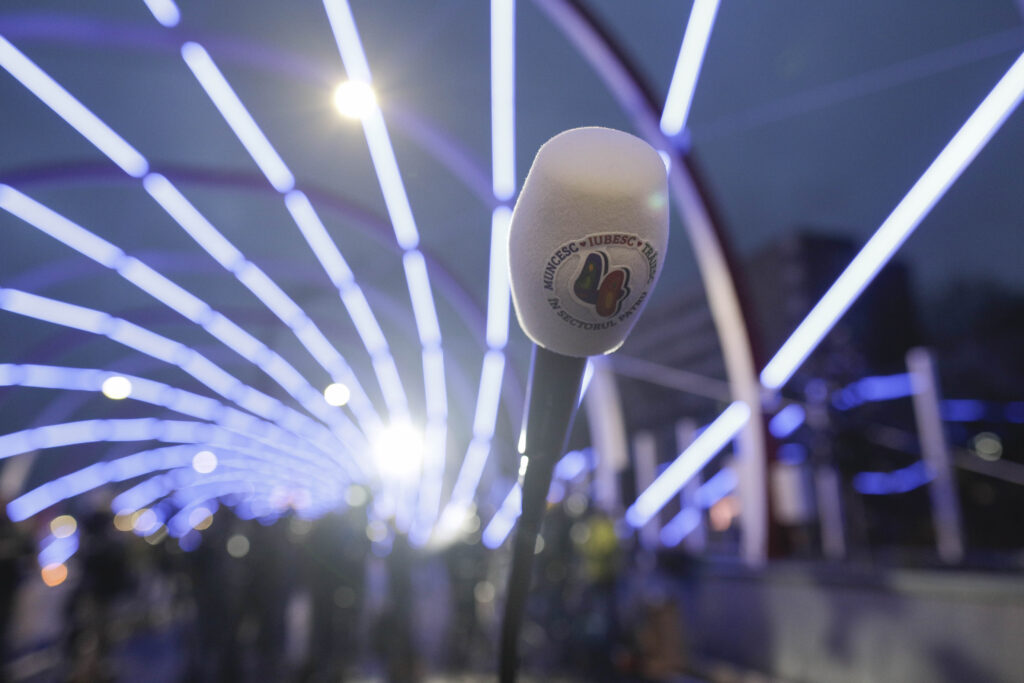 Microfonul Primăriei Sectorului 4, cu presa pe fundal, la inaugurarea pasajului din cartierul Berceni. Foto: Octav Ganea/Inquam.