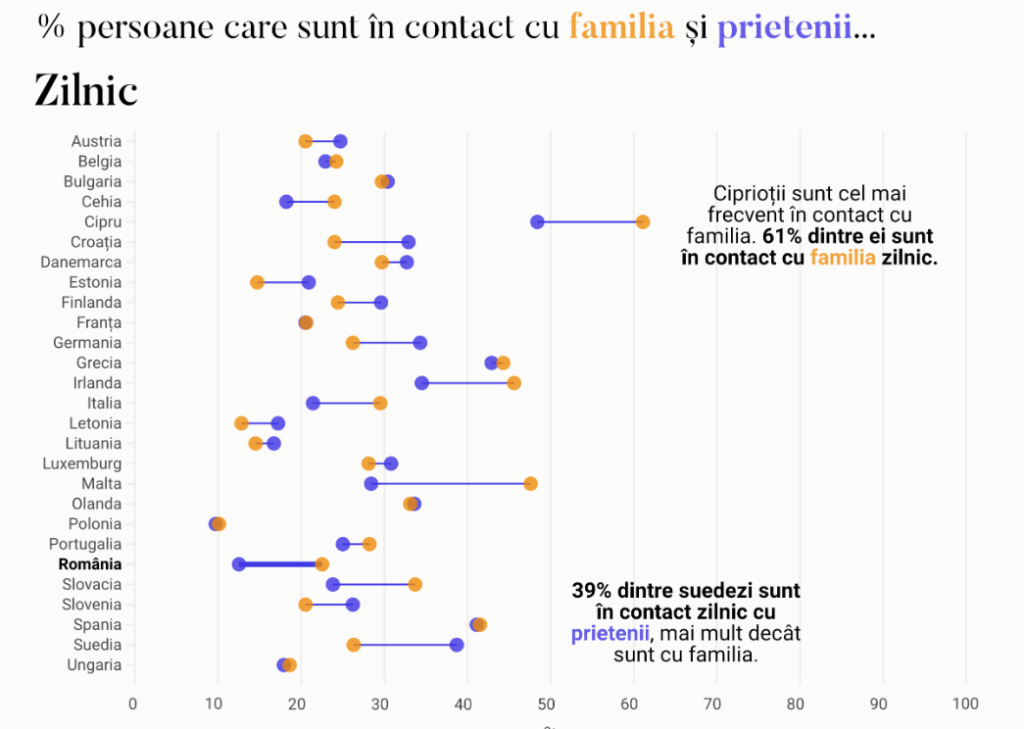 Unii europeni și-i țin mai aproape decât pe propria familie, cum sunt nordicii. Alte popoare nu discriminează, iar altele favorizează contactele cu familia și mai puțin pe cele cu prietenii. Românii sunt undeva la mijloc, ca frecvență. Nici prea-prea, nici foarte-foarte. Însă primează familia în fața prietenilor.