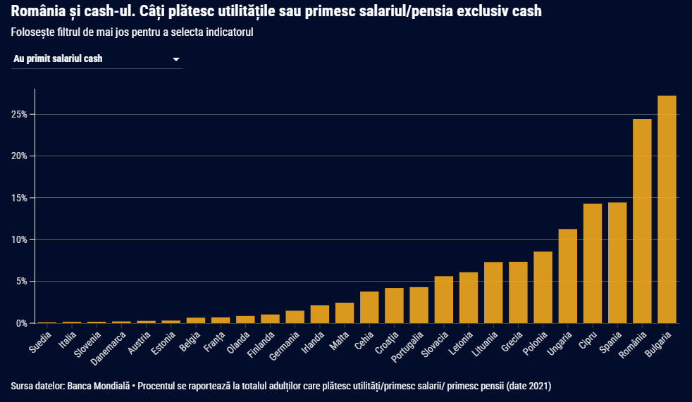 În ultimii ani, Uniunea Europeană a adoptat diverse măsuri pentru a reglementa plățile în numerar, în ideea de a combate evaziunea fiscală, spălarea de bani și finanțarea terorismului. Românii iubesc însă cash-ul. Din lipsă de educație, din prevalența muncii la negru și a evaziunii fiscale sau din lipsa infrastructurii bancare, în România, un procent semnificativ de persoane încă plătesc utilitățile și primesc salariul în numerar, ne arată Edit Gyenge în acest infografic pe care îl găsiți complet aici.