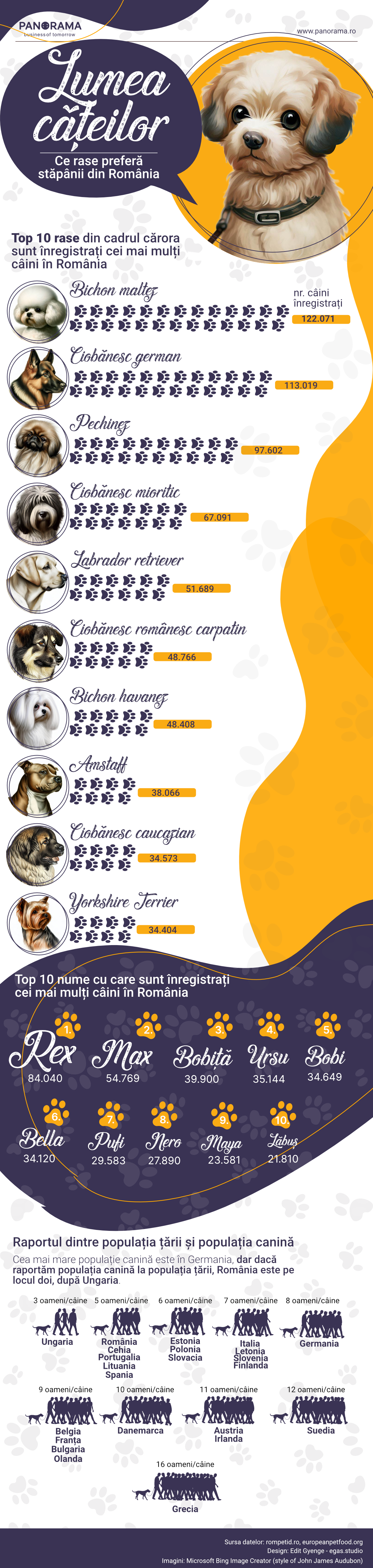 Infograficul de mai jos prezintă distribuția și caracteristicile câinilor înregistrați de stăpâni în România. Pentru marea masă a câinilor fără stăpân sau fără rasă certificată, nu există estimări.