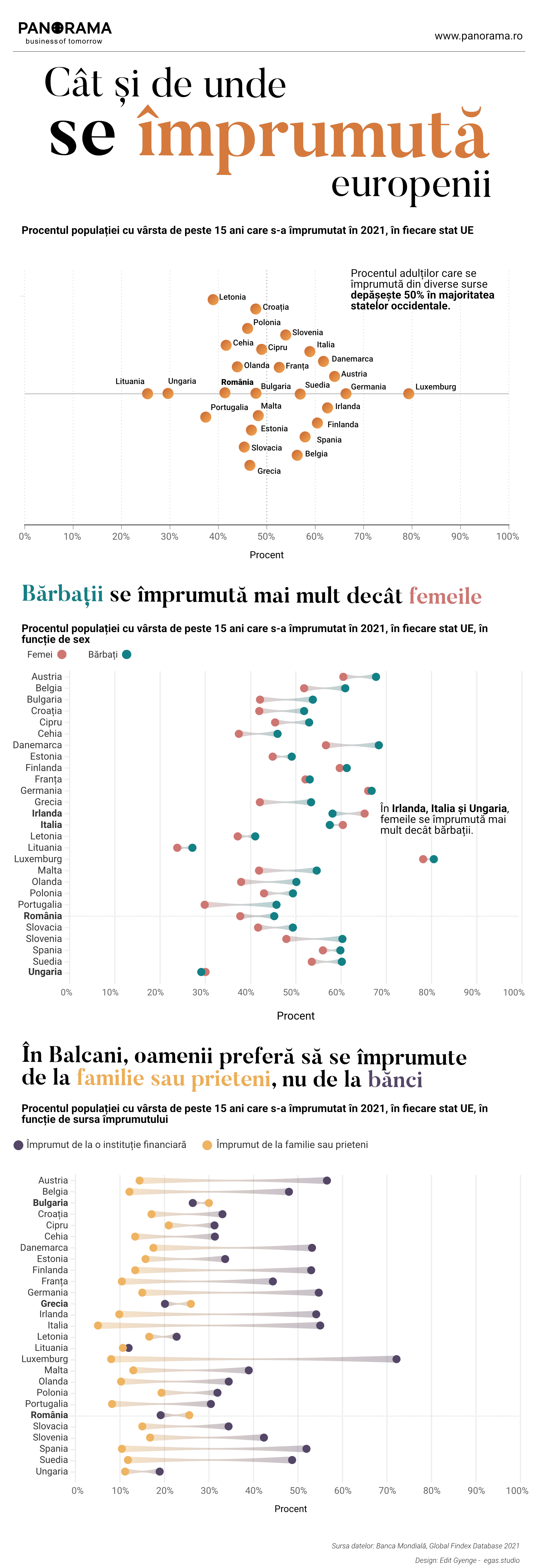 În medie, jumătate din populația adultă a Uniunii Europene ia bani cu împrumut, potrivit datelor Băncii Mondiale. Nu vorbim doar despre creditele bancare, ci despre toate categoriile de împrumuturi, inclusiv de la familie și prieteni.