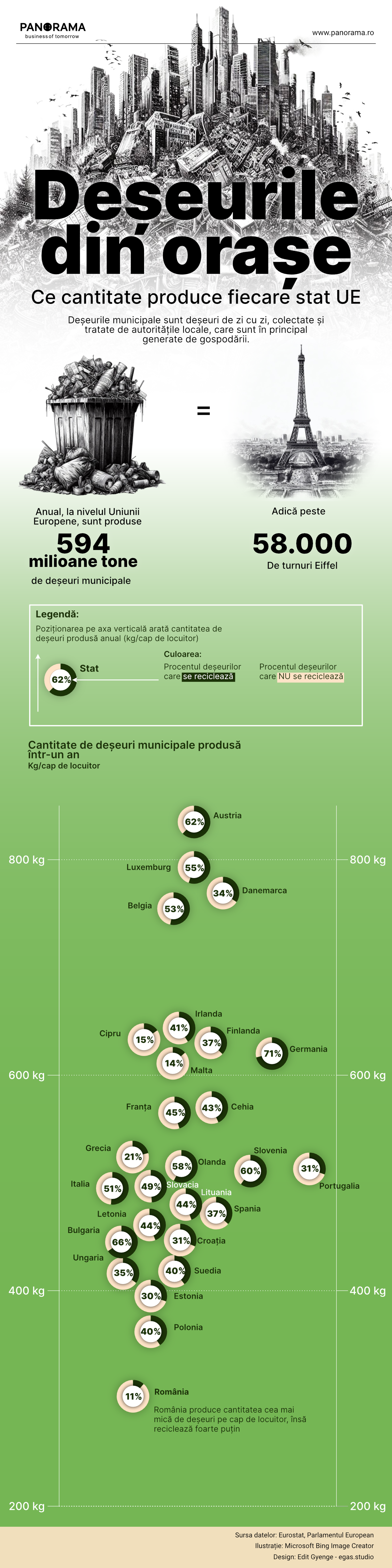Pentru a avea un termen de referință pe care să-l cuprindem ușor, turnul Eiffel are o greutate de 10.100 tone. Asta înseamnă că întreaga cantitate de deșeuri municipale produsă într-un an de Uniunea Europeană (594 milioane de tone) echivalează cu peste 58.000 de turnuri Eiffel.