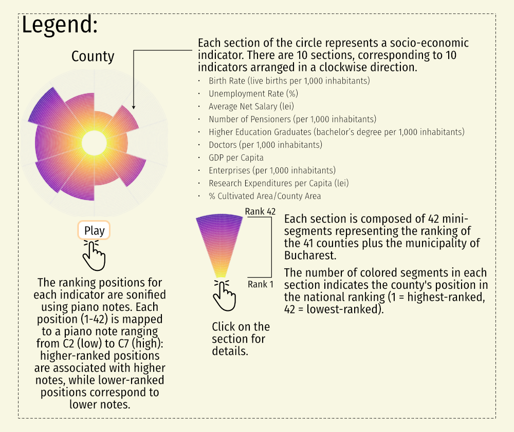On the page dedicated to each county, you’ll find historical trends for these indicators. Below is a summary of each county’s position in the national rankings for 10 relevant indicators. The information is presented visually and audibly according to the legend below, or you can select a county from the menu to explore its dedicated page.