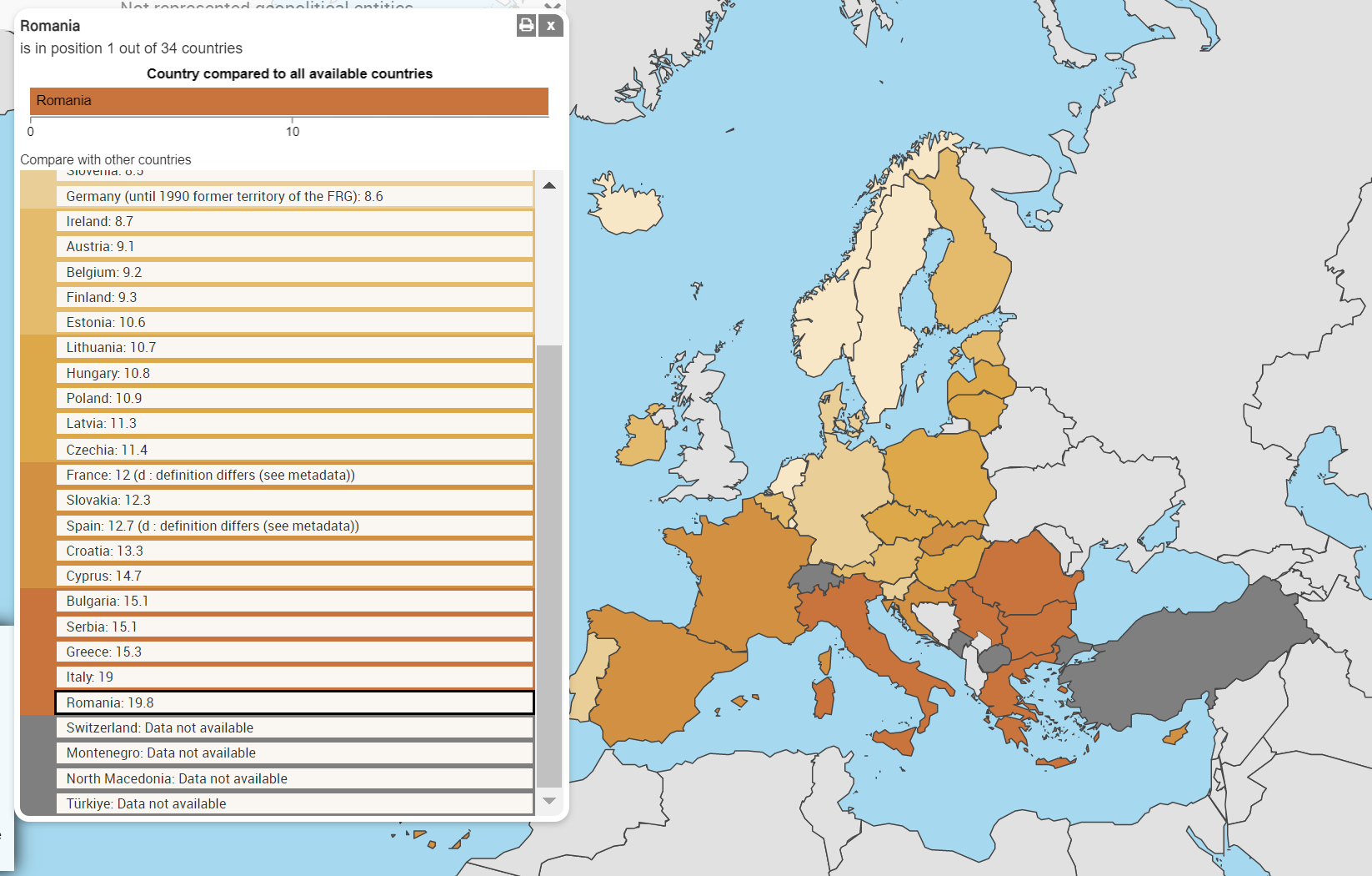 Ponderea tinerilor europeni de 15-29 de ani care nu erau angajați sau înscriși într-o formă de educație și formare în 2022 / sursa: Eurostat