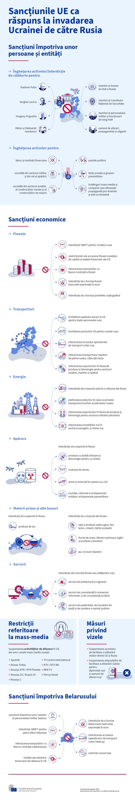 Lista la zi a sancțiunilor UE ca răspuns la invadarea Ucrainei de către Rusia e prezentată mai jos, în limba engleză. Click pe imagine pentru a mări. O versiune anterioară, în limba română, poate fi consultată aici. Sursa: Consiliul UE