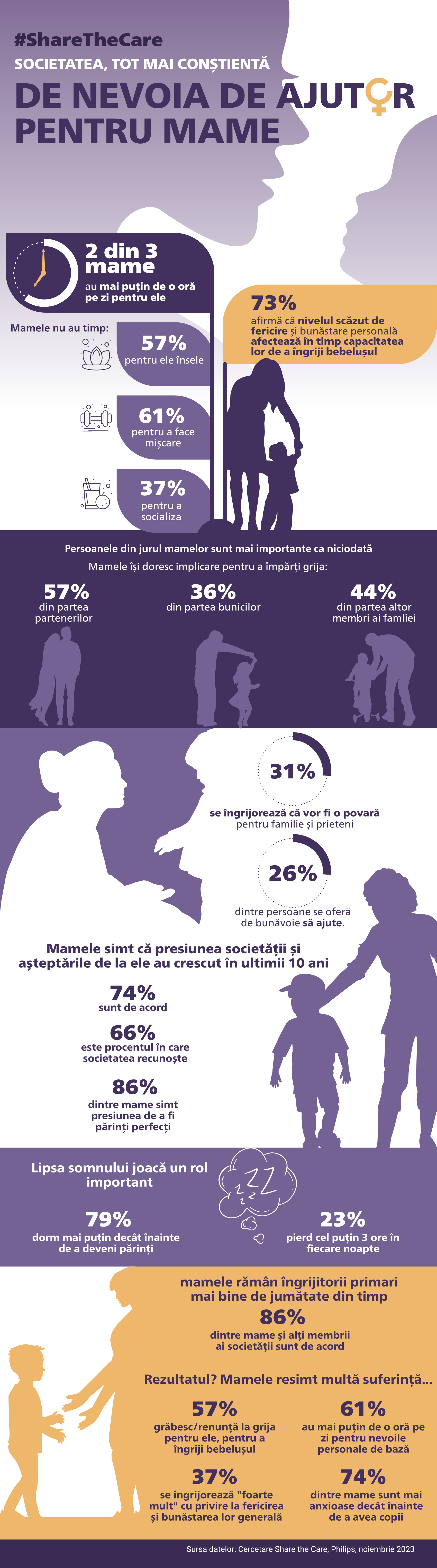 * Datele fac parte dintr-o cercetare internațională efectuată de OnePoll, în numele Philips, în noiembrie 2023, cu 12.000 de mame cu copii cu vârsta cuprinsă între 0-3 ani în fiecare din următoarele țări: SUA, Franța, India, Indonezia, Polonia, Turcia, Brazilia, Germania. Cercetarea include, de asemenea, întrebări adresate înspre 2.000 de membri ai populației generale (gândite pentru a fi reprezentative la nivel național, pe baza vârstei/sexului/regiunii), în fiecare dintre aceleași țări enumerate mai sus (16.000 de respondenți ai populației generale).