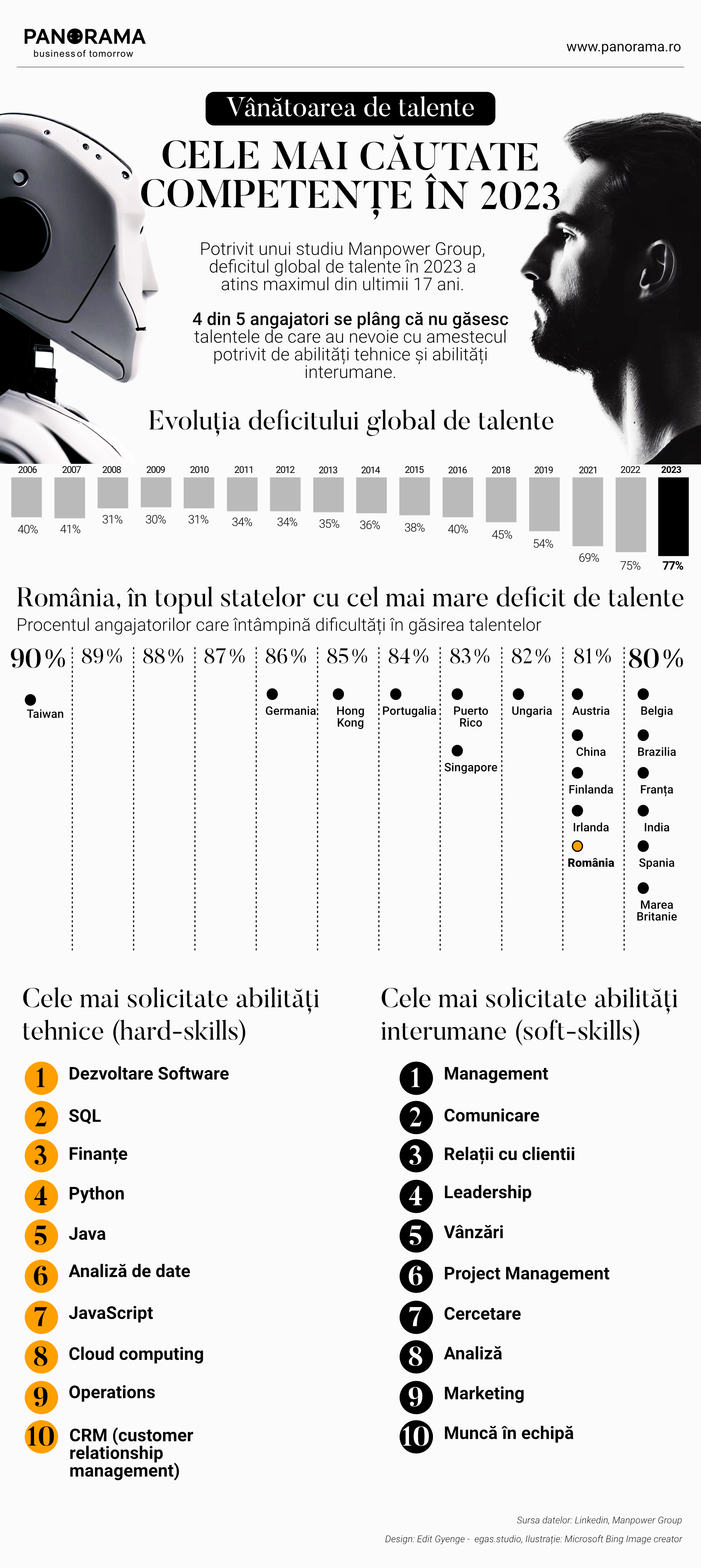 România este pe locul 7, alături de Austria, China, Finlanda și Irlanda, la deficitul de talente. 81% dintre angajatorii români spun că întâmpină mari dificultăți în angajarea persoanelor potrivite pentru rolurile pe care le au neocupate.