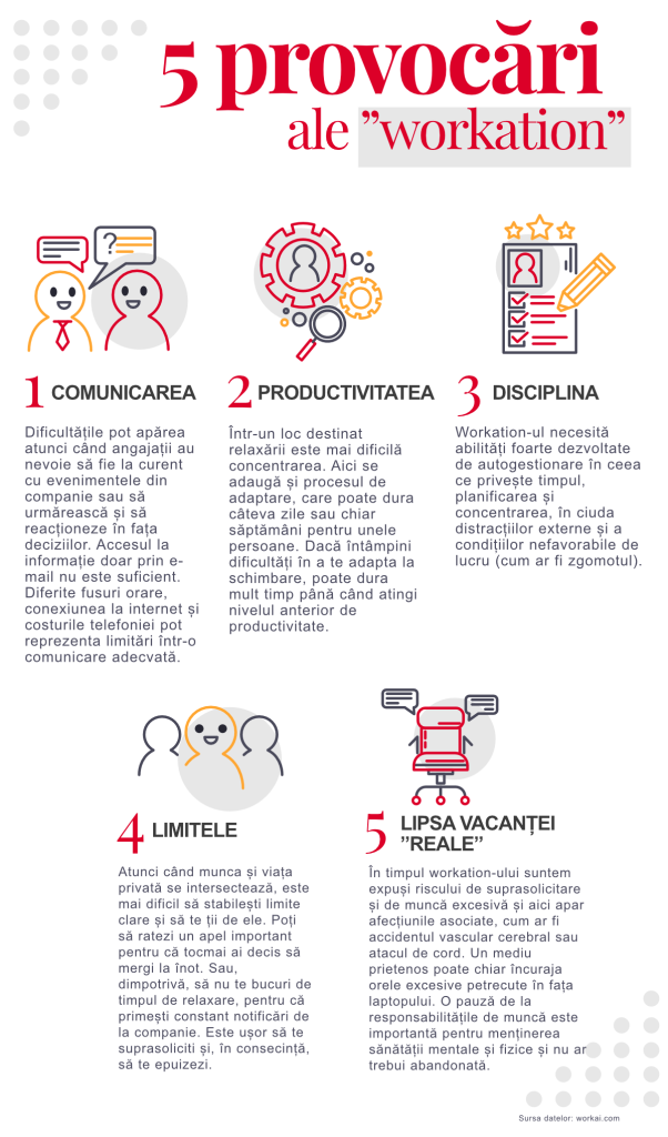 Potrivit Workation.com, o agenție de turism pentru cei care lucrează de la distanță, mai bine de două treimi dintre americanii care aleg workation sunt mai puțin tentați să demisioneze, iar 81% au spus că au devenit mai creativi la job. Pe lista motivelor care fac bine lucrului din vacanță se mai numără și faptul că au simțit că au putut face față mai bine burnout-ului și că se simt mai mulțumiți de job-ul pe care îl au.